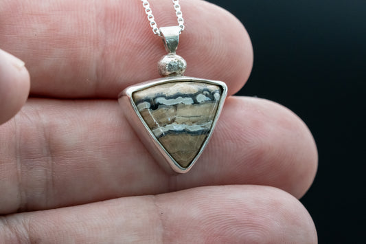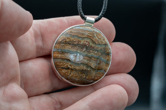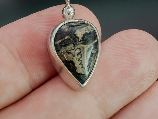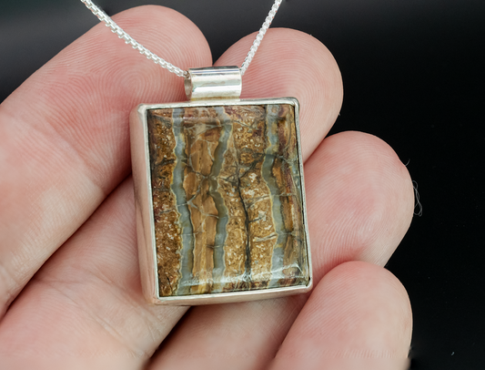 Every fossil for sale here was found on the bottom of the ocean by either myself or my wife. Each fossil is stabilized, cut, shaped and polished into the final stone and then set in silver. Every step is done personally.